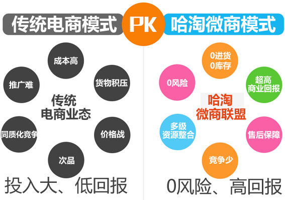 公司有强大的后台技术开发团队,利用微信第三方市场的兴起,开发了哈淘微信商城,集购物、物流、会员管理、利润分成、社区于一体。公司率先在国内带动了垂直电商这一商业理念,与生产厂家合作,建立厂家到消费者的直接链接,向消费者提供低价优质的商品。同时平台让利给消费者,取代传统商业的层层代理,让消费者升级为消费商,消费者参与到商业利润的分配中,从而实现全民电商的终极目的。
