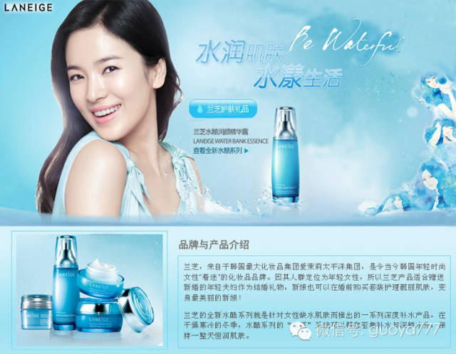 Laneige(兰芝):兰芝,是当年中国首批正牌进口的韩国品牌,面向的顾客群体也十分广泛。法语里,laneige意味着雪,冬去春来,雪幻化成水,第一道融雪幻化出的曙光,水和光的“浪漫相遇”。顾名思义,兰芝最核心的就是水,从兰芝的护肤系列来看,确实也是如此。从兰芝首创“定制水”,以最佳比例调配出最适合肌肤的“黄金比例”优选矿物水,升级WaterPumpSystem“水泵”保湿系统,兰芝在护肤保湿这条路上,一直在进步。当然,兰芝也是韩国本土市场占有率很高的护肤品牌,性价比很高的大众护肤。